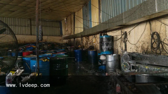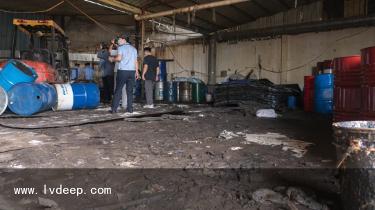 「現(xiàn)場用于壓平桶身的平整機(jī) 」 處置懲罰過程中工人任由廢鐵桶里面的殘留物流出地面滿是黏糊糊的不明物質(zhì)車間內(nèi)彌漫著刺鼻的氣味可見現(xiàn)場揮發(fā)性有機(jī)化合物氣體 的濃度十分高在切割過程中極易發(fā)生爆炸