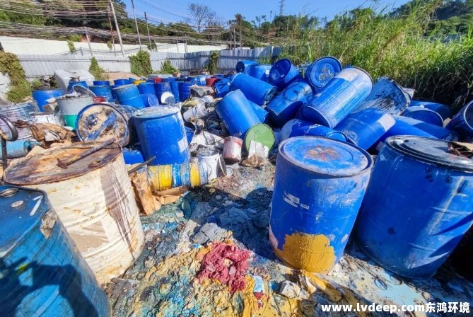 該拆解場設有廢鐵桶和廢膠桶回收、切割、壓板等工序以及2臺切割機、1臺壓板機等設備。經初步清點,執法人員現場發現廢鐵桶166個,藍色膠桶56個,經壓平沾有油污的鐵皮400張。清點過程中還發現,部分廢桶內存有明顯刺激性氣味的廢液,部分廢桶上粘貼有易燃或有毒等標簽,且堆放廢桶區域及拆解區域地面上發現大量異色黏糊液體且滲入土壤。執法人員現場委托第三方檢測機構對受污染的土壤取樣檢測。經稱重核實,現場廢物合計17.57噸。