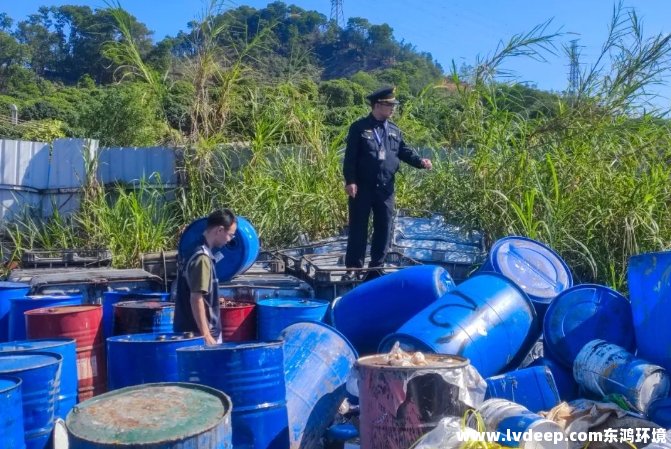 為打擊危險廢物環境違法犯罪行為,東莞市生態環境局塘廈分局持續對槽罐車偷排行為、邊角地塊非法處置危險廢物作坊等開展摸排打擊,近日利用無人機在某社區邊角區域發現一非法拆解廢桶場所。