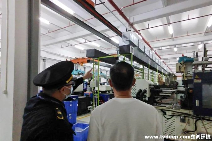 執(zhí)法人員現(xiàn)場檢查發(fā)現(xiàn),該企業(yè)的注塑成型工序所在的注塑車間未密閉,注塑車間雖然設(shè)有廢氣收集管道,但是管道沒有設(shè)置鼓風(fēng)機(jī),也沒有連接配套的廢氣處理設(shè)備,注塑機(jī)沒有配套集氣罩,注塑廢氣未經(jīng)處理通過車間門窗直接排至外環(huán)境。上述情況與該企業(yè)《驗(yàn)收意見》中“注塑成型設(shè)在密閉的車間內(nèi),在廢氣產(chǎn)污節(jié)點(diǎn)設(shè)置集氣罩抽風(fēng)收集后,收集部分經(jīng)1套‘水噴淋+干式過濾器+二級(jí)活性炭吸附裝置’,后進(jìn)行二次處理設(shè)施升級(jí)改造為‘水噴淋+旋流塔+活性炭濃縮+催化燃燒’處理后經(jīng)30m高排氣筒高空排放”的記載不一致。