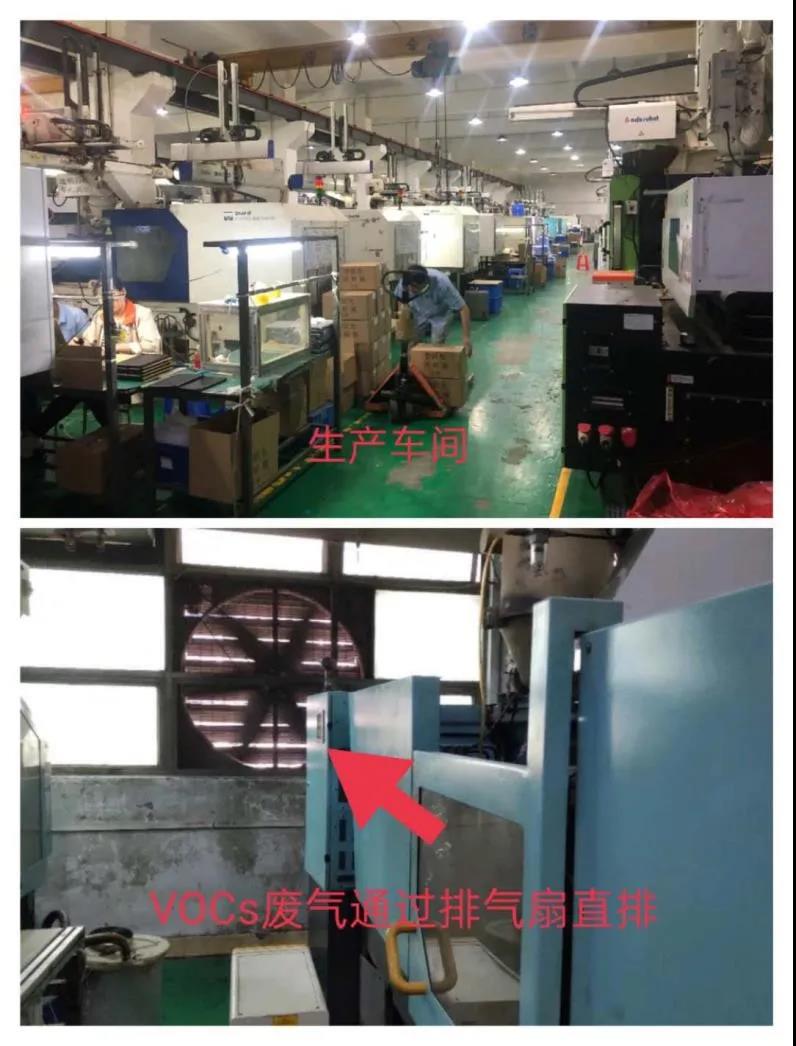 現場檢查時,該單位正在生產,注塑機正在使用,但未配套廢氣防治處理設施,注塑機產生的非甲烷總烴廢氣未經處理無組織排放。部分有機廢氣通過排氣扇直接排放,涉嫌逃避監管行為。
